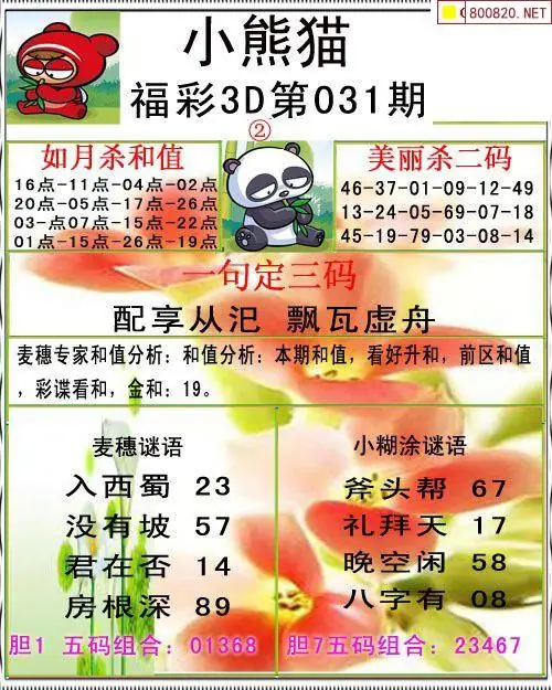 小熊猫26031期美安和值+一句定三码3d图谜