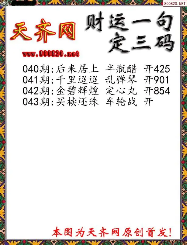 043期财运3D一句定三码字图谜