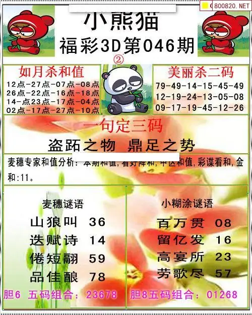 小熊猫26046期美安和值+一句定三码3d图谜