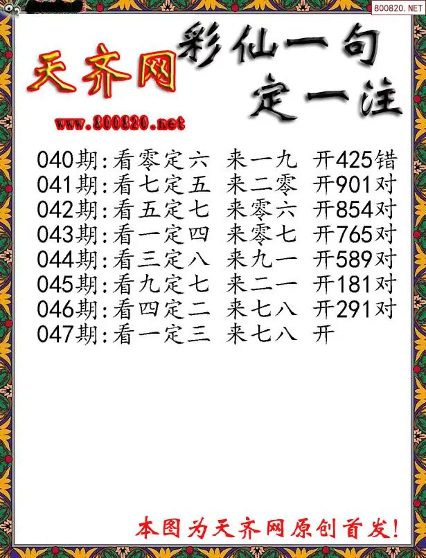 047期彩仙一句定三码3D字图谜