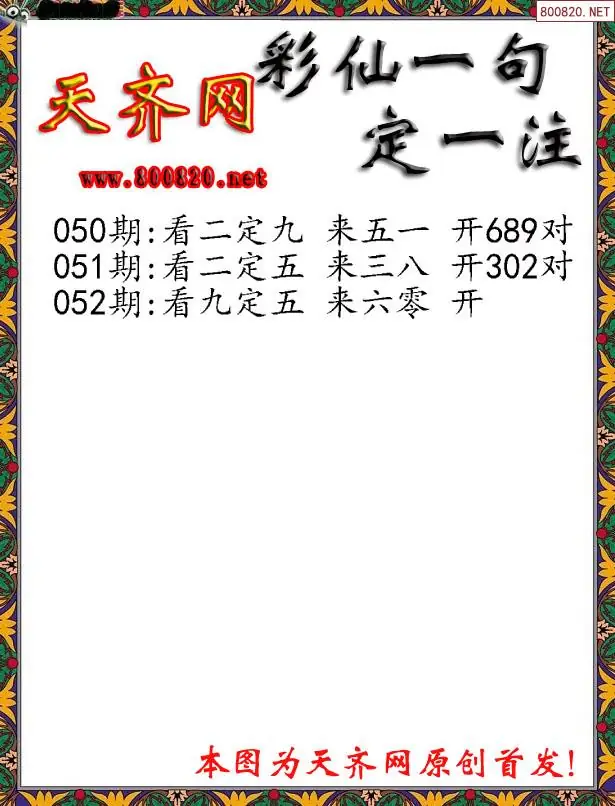 052期彩仙一句定三码3D字图谜