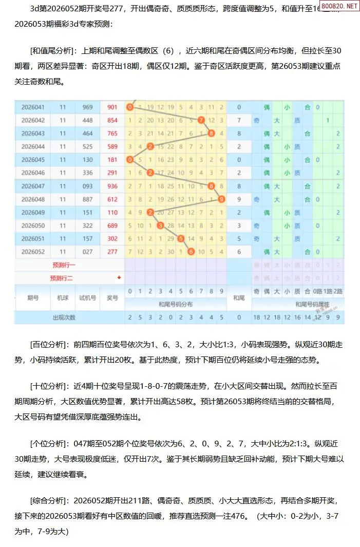 福彩3D第2026053期[玩彩高手]最准最新3d号码预测