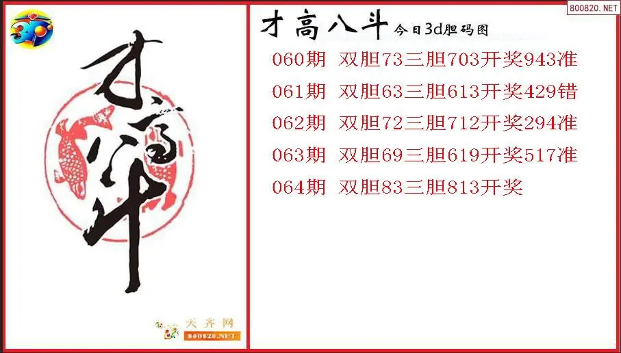 才高八斗2026064期今日3d胆码图(原创)