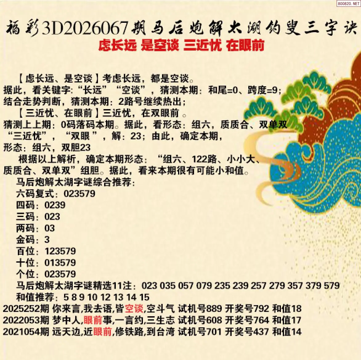 3 26年067期 3D专家解今日太湖字谜