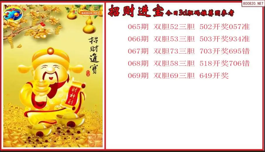 招财进宝2026069期今日3d胆码推荐图参考(原创)