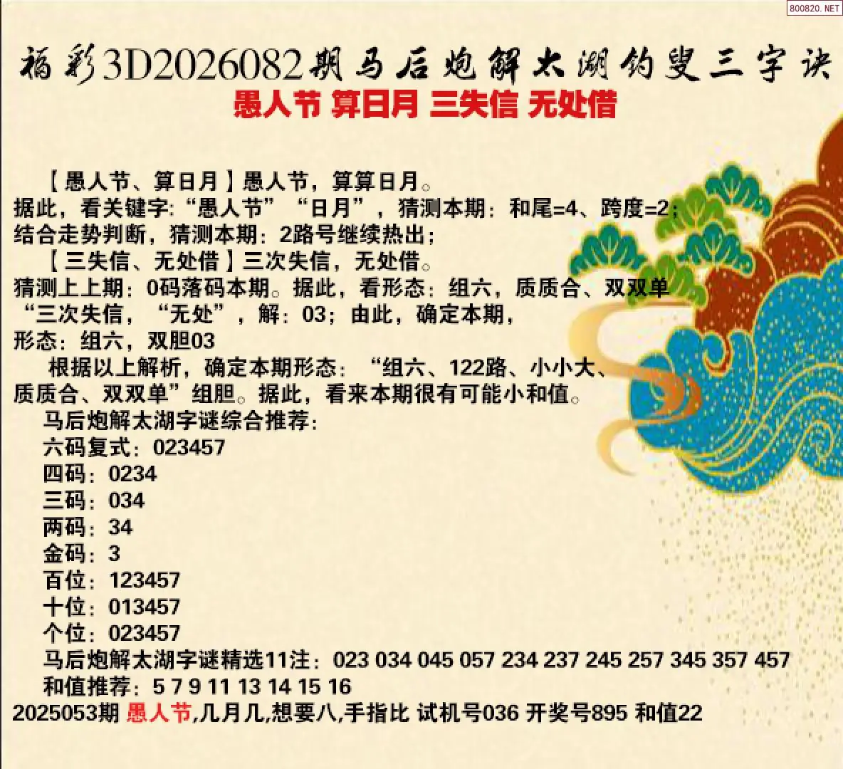 26年082期马后炮解太湖字谜之-愚人节 算日月 三失信 无处借