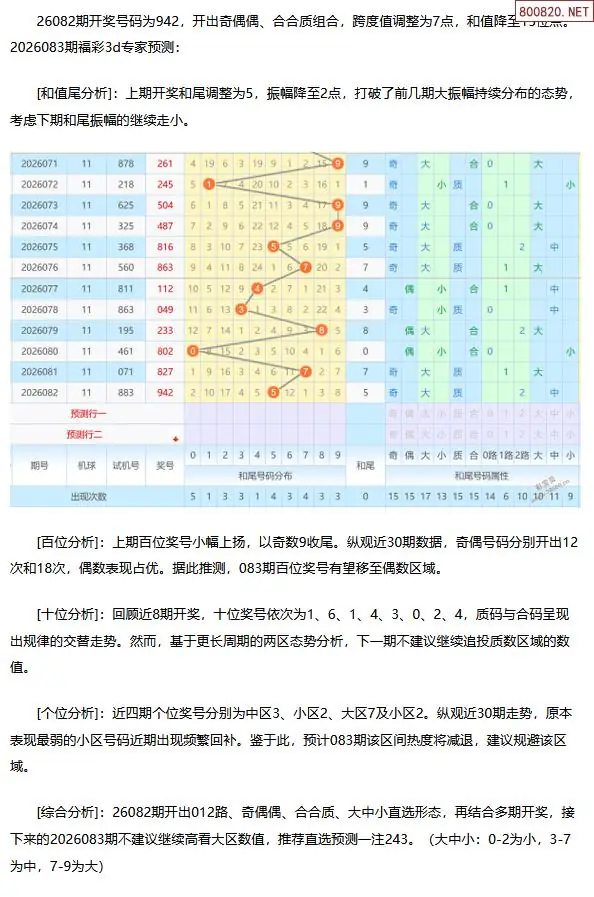 福彩3D第2026083期[玩彩高手]最准最新3d号码预测