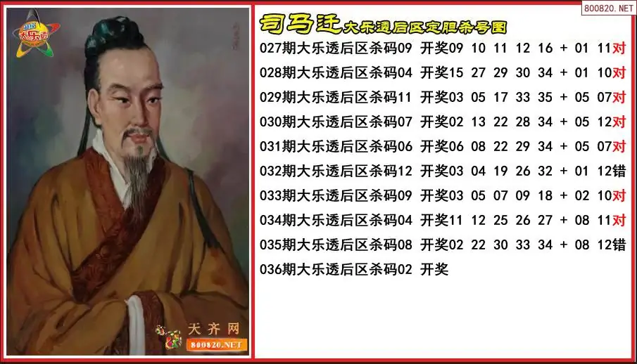 司马迁2026036期大乐透后区定胆杀号图-原创
