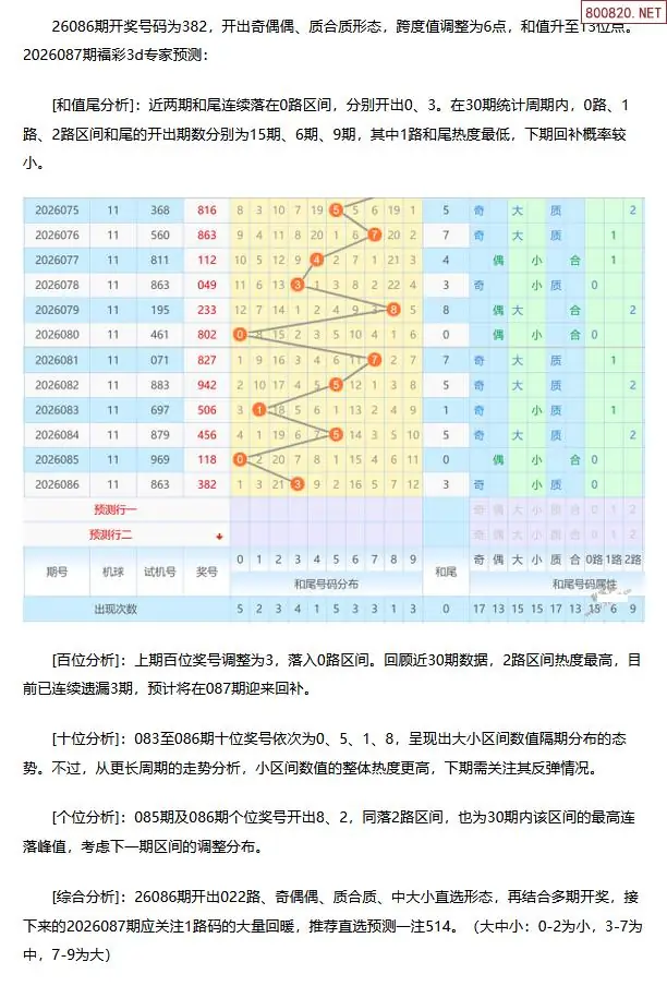 福彩3D第2026087期[玩彩高手]最准最新3d号码预测