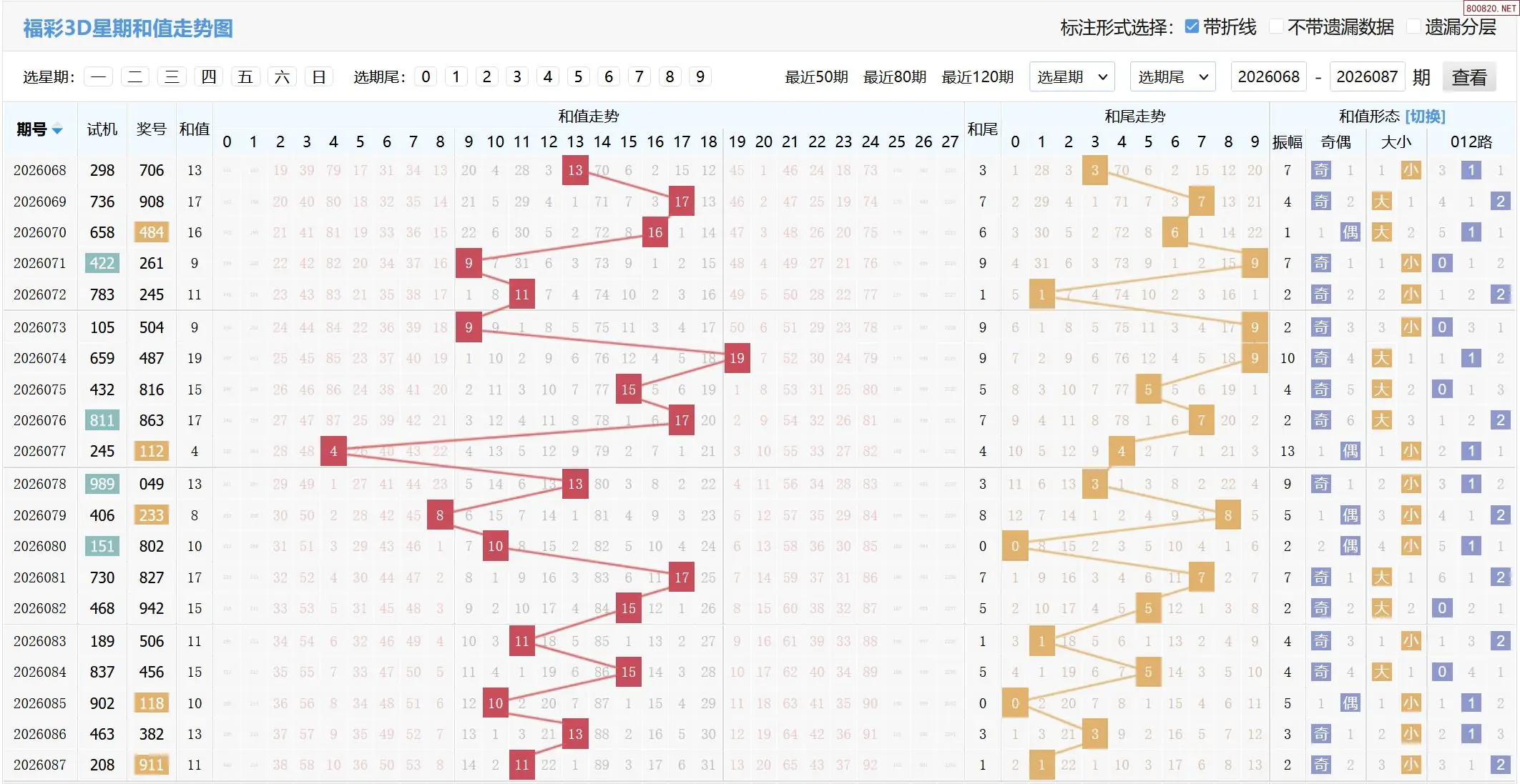 2026088期福彩3D和值和尾走势图如下: