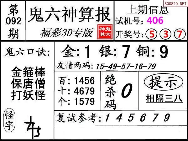 14 鬼六图26092期鬼六神算报+鬼六胆码
