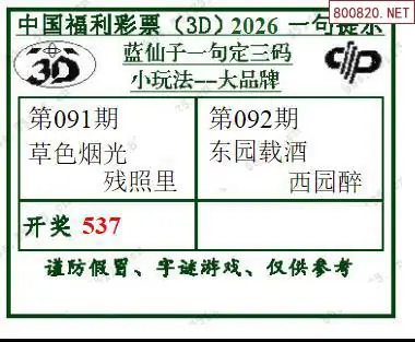 2026092期蓝仙子一句定三码3d图谜