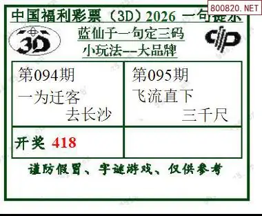 2026095期蓝仙子一句定三码3d图谜