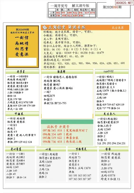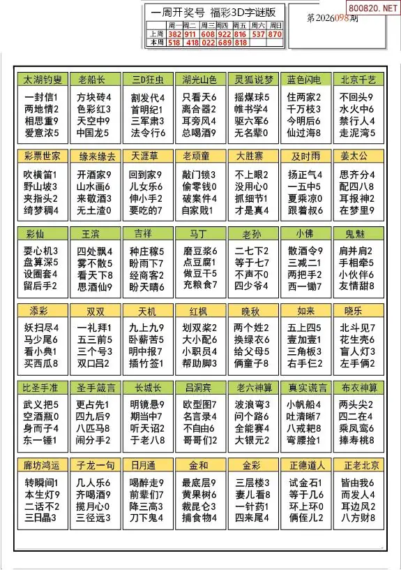 26年098期解太湖3d字图迷汇总彩报