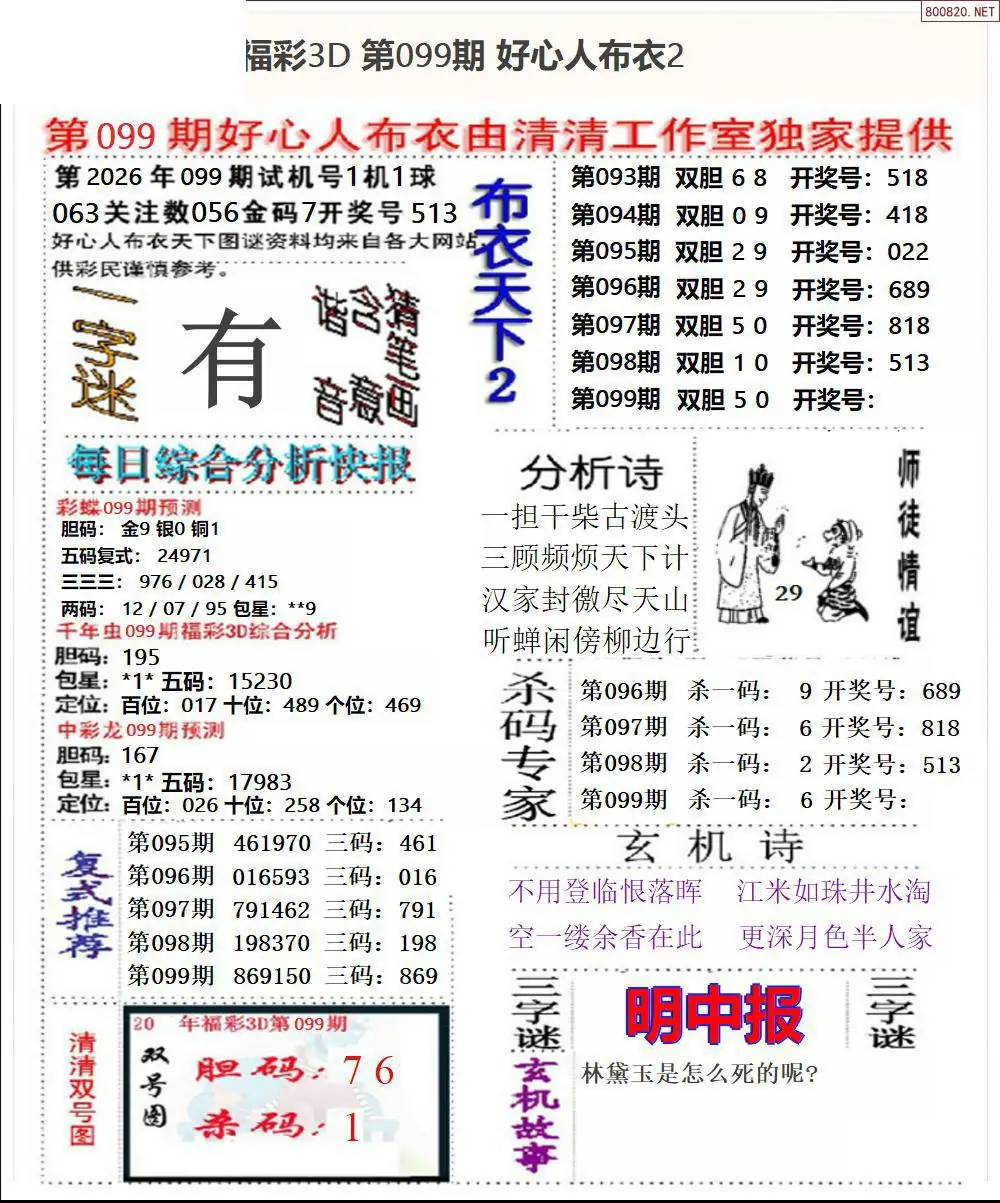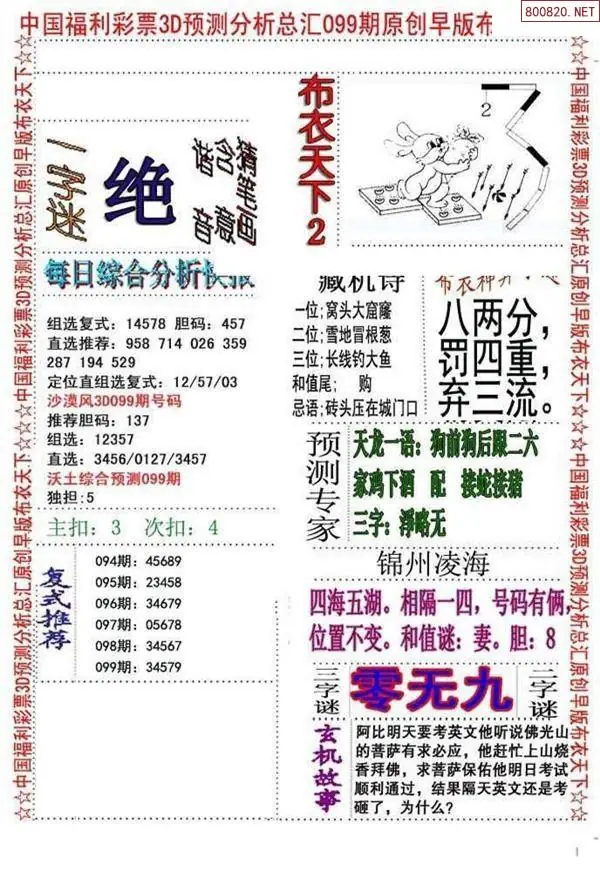 福彩3D099期北盟天机图迷