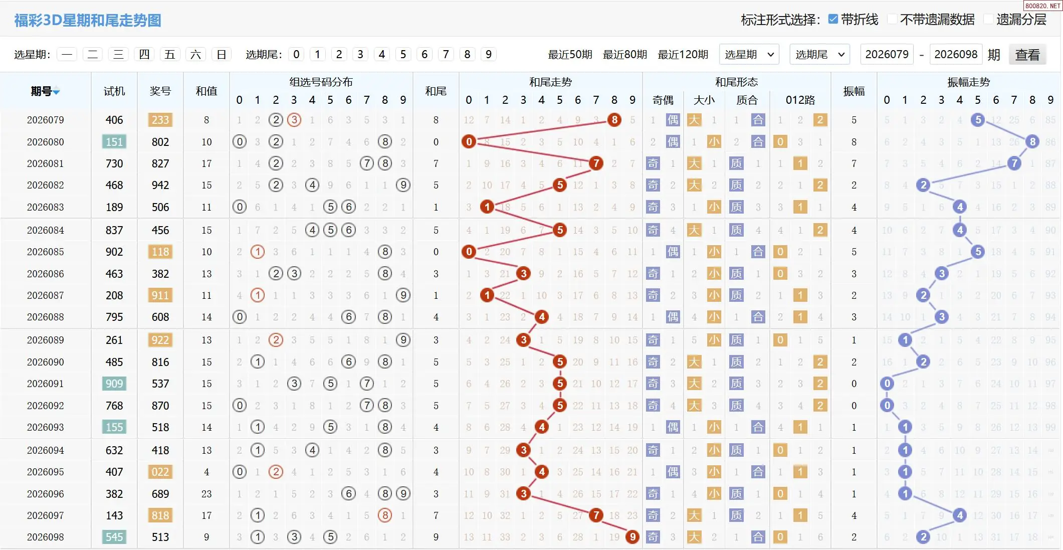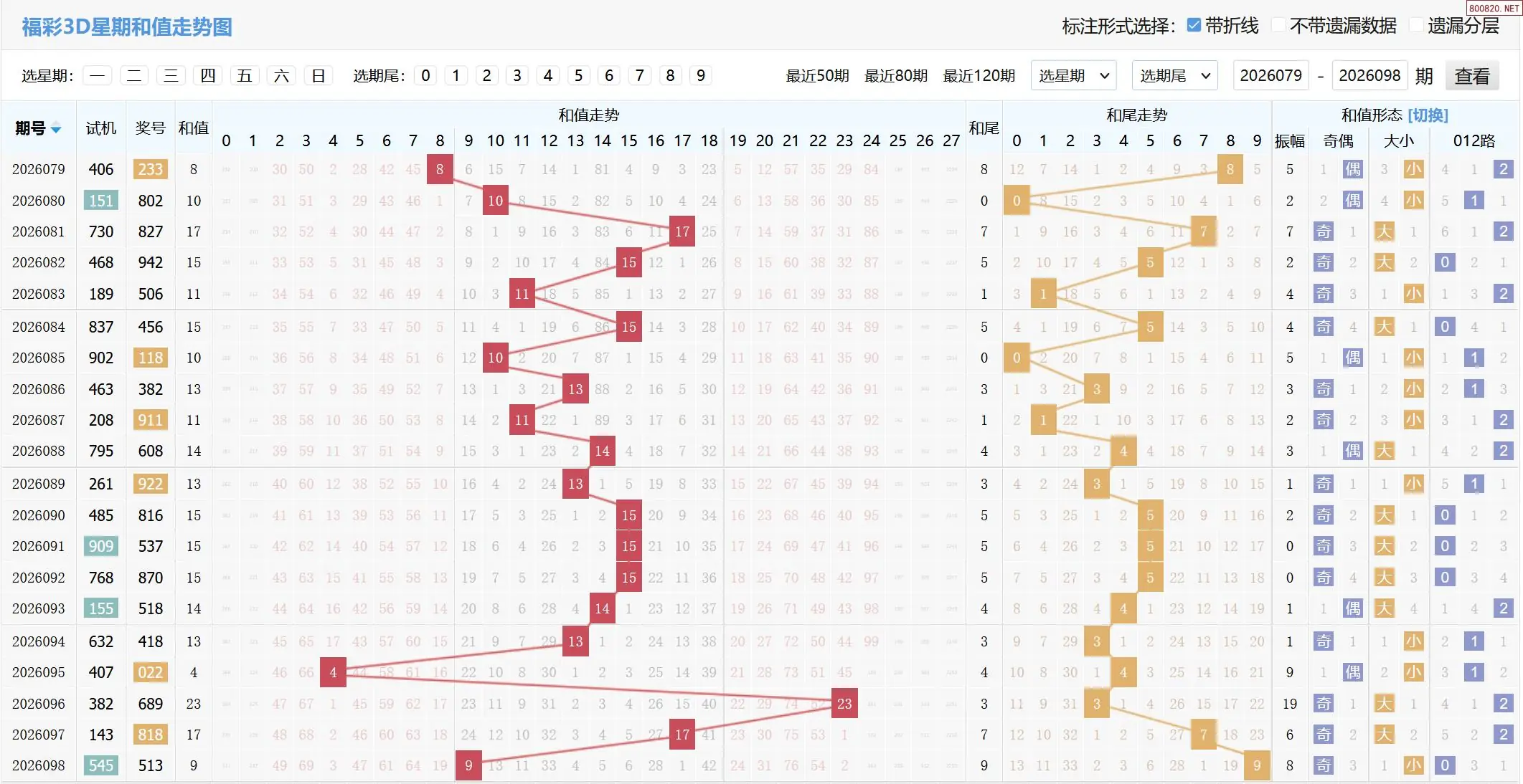 2026099期福彩3D和值和尾走势图如下: