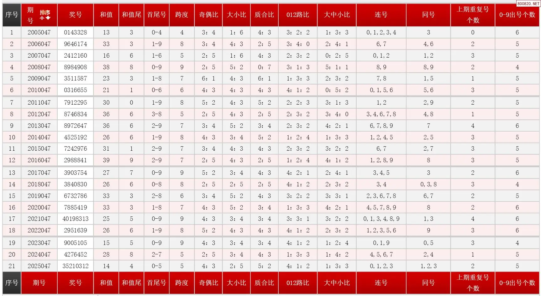 047期体彩七星彩历史同期对比图表+近期走势图分析